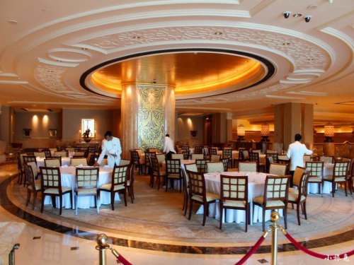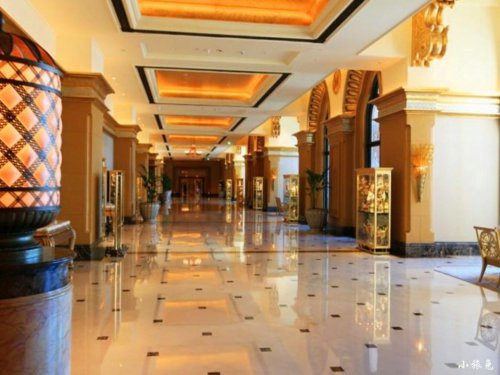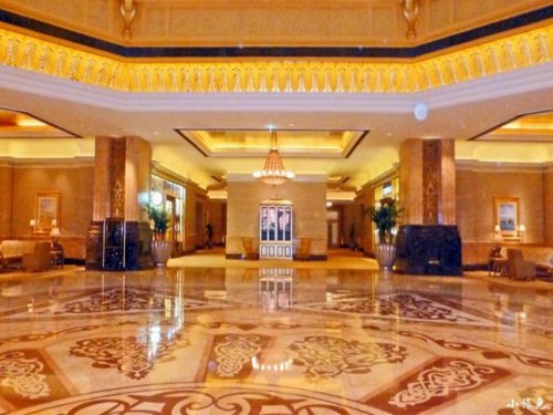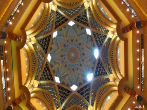 該酒店耗資近30億美元,坐擁85公頃園林和1.3公里黃金海岸,是一座古典式的阿拉伯皇宮式建筑。酒店的外形仿佛是一座水上清真寺,有著濃郁的中東風情。其內(nèi)部更是金碧輝煌。據(jù)說耗盡22噸純金打造,更有海量的大理石、價值不菲的油畫裝飾和上千盞特別定制的施華洛世奇水晶吊燈……據(jù)說,有10名工作人員專職保持其清潔。