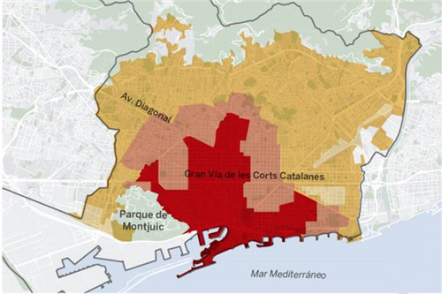 巴塞羅那市區(qū)被劃為四大塊(如圖所示),以深紅、淺紅、深黃和淺黃四色劃分,顏色越深,酒店業(yè)限制越嚴厲。