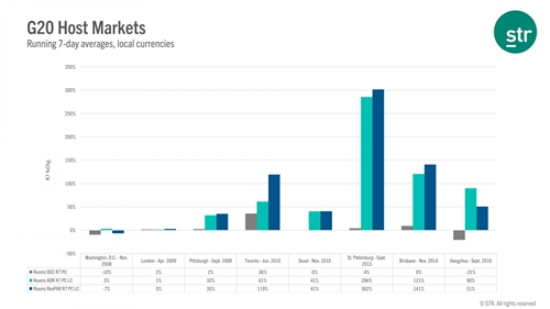 STR研究發(fā)現(xiàn),主辦G20峰會對酒店的平均每日房價(ADR)的影響比入住率更大。