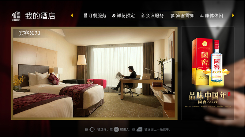 比如,通過宏輝智通酒店智能互動視訊系統系統,在客人需要用餐的時候,客人可查詢飯店內不同餐廳的不同價位,并可預訂餐桌及通過預定用餐要求送餐。利用酒店智能互動視訊系統,按摩、洗浴等服務也可預訂,隨時為客人服務。另一方面,酒店也可以通過酒店智能互動視訊系統把相關的促銷信息通過滾動字幕的形式發布,提高酒店收益。