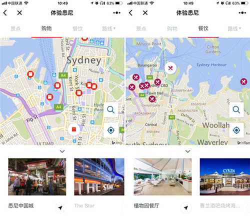去悉尼旅游時,到達目的地之后,只要用微信打開“體驗悉尼”,小程序就會根據你的地理位置為你推薦附近的旅游景點。