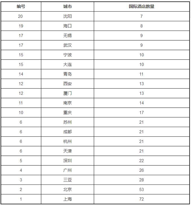 新聞來源:宏輝智通 發布日期:2017-12-04 瀏覽次數:3809國際五星酒店數量最多的是上海, 共72家,比北京整整多出19家,排名前20的城市中,江浙一帶酒店比重偏多,南京、無錫、寧波均有上板。