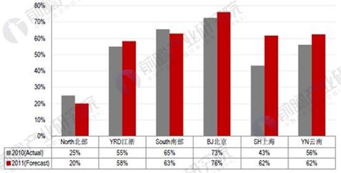 在入住率方面,我國(guó)南部地區(qū)精品酒店的入住率遠(yuǎn)高于北部地區(qū),兩者2011年入住率分別是63%和20%。從重點(diǎn)城市來(lái)看,北京的精品酒店入住率最高,在75%左右;其次是云南和上海,其入住率在2011年上升較快,均達(dá)到62%;浙江2011年的精品酒店入住率為58%。