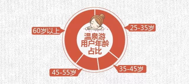 監測數據顯示,立冬以來,溫泉游產品預訂出游人次同比上漲36%。每年11月份至次年2月份是溫泉度假消費需求的旺季,隨著氣溫持續走低,預計接下來預訂溫泉養生游產品的用戶會越來越多。從溫泉線路預訂人群來看,用戶年齡層呈現出“兩極分化”的特征,預訂人群主要以60歲以上爸媽游用戶以及25-35歲的都市白領為主。泡溫泉已經不僅僅是老年游客的專利,依托溫泉療養放松解壓也已成為快節奏壓力下都市白領度假休閑的新時尚。年齡分布在35-50歲的客群因“上有老、下有小”,預訂相關產品以帶孩子或攜父母全家出游為主。