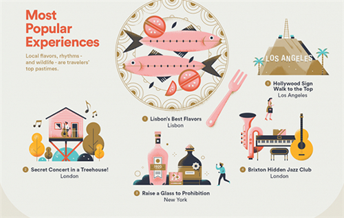2018年最受歡迎的體驗預(yù)計在里斯本,旅客可以在那里感受最純正的當(dāng)?shù)仫L(fēng)味。其他熱門體驗包括登頂洛杉磯的好萊塢地標(biāo)、解秘倫敦的隱藏爵士樂俱樂部或秘密樹屋、探索紐約的“禁酒令時代(1920年–1933年)”。