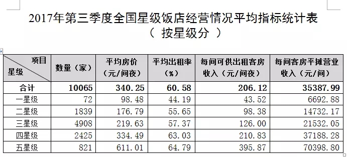 全國星級飯店第三季度平均房價為340.25元/間夜,平均出租率為60.58%,每間可供出租客房收入為206.12元/間夜,每間客房平攤營業收入為35387.99元/間。