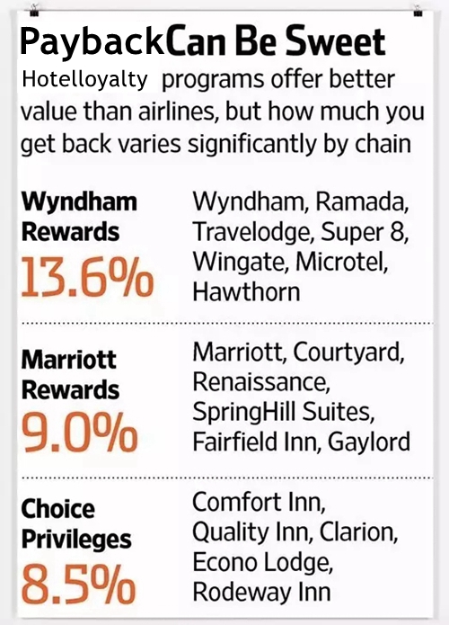 Scott McCartney比較后認為,溫德姆酒店集團(Wyndham Hotel Group)的忠誠獎賞計劃是目前表現(xiàn)最好的。溫德姆酒店集團擁有超過7800家經(jīng)濟型酒店、四星中檔酒店、海灘度假村和五星級豪華酒店,品牌有華美達、戴斯、速8等。