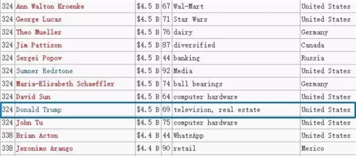 ▼ 2016年《福布斯》全球億萬富豪排行榜中特朗普以45億美元家產排名324位