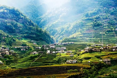 路上,耶律往窗外亂看,突然一個村子闖進視野。層巒腳下,梯田之上,幾間白色平房,錯落拼湊出一個小村子的模樣,滿眼都是深深淺淺的綠色和霧氣蒸騰。