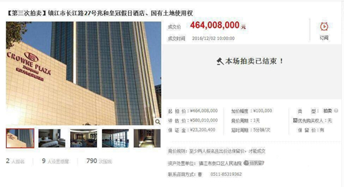 鎮(zhèn)江兆和皇冠假日酒店4.6億余元成功拍賣