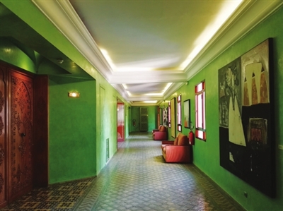 如果比較摩洛哥的國際品牌和本土品牌,感覺本土品牌在色彩運用上更多樣少禁忌,許是摩洛哥早年歸屬法國又離西班牙近,受法國人的浪漫和西班牙人奔放的民族性格影響,雖全民信仰穆斯林,但宗教并沒有限制他們對美的追求。在參觀本土品牌SAADl酒店的客房時,記者看到每一層使用的顏色不同,一會兒全層都是藍,一會兒全層都是綠,那藍那綠上還精雕著細致的粉的白的花紋。從樓道到房門到房間,就算見多識廣的記者,也驚嘆不已,真是佩服設計師,簡直是肆無忌憚呀!樓道是深湖藍色,墻上掛著的大幅畫作主調是藏藍色;粉色墻面房門卻是綠色的。身陷色彩之中,越看越覺得生動,和諧,高雅。